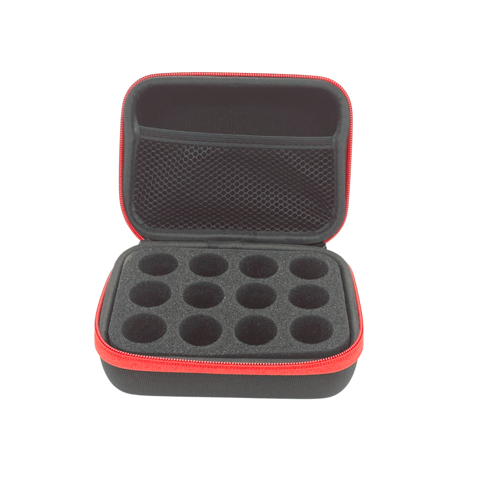 Organizator pentru 12 sticlute uleiuri esentiale, cu fermoar rosu.
