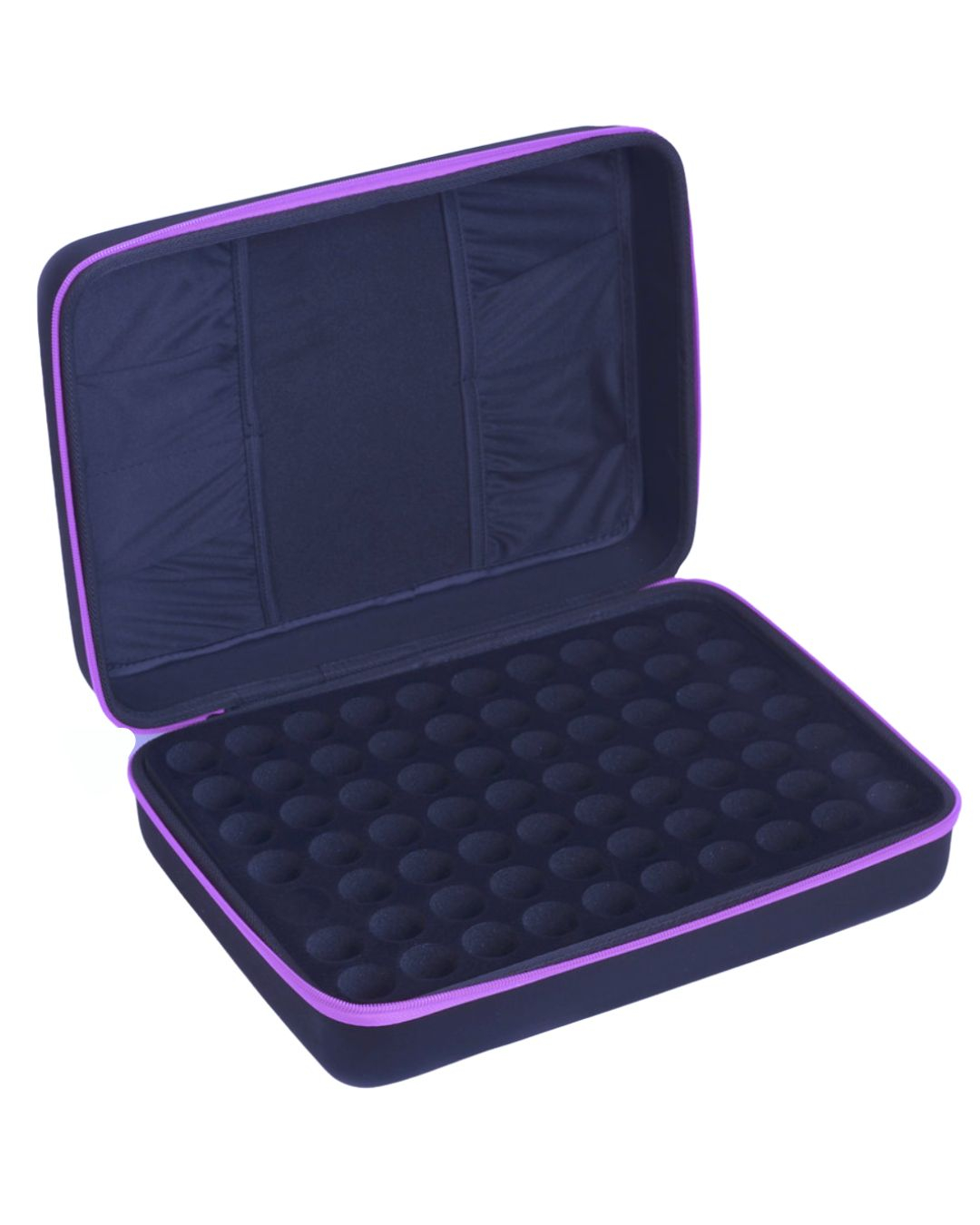 Organizator pentru 70 sticlute uleiuri esentiale, cu fermoar mov.