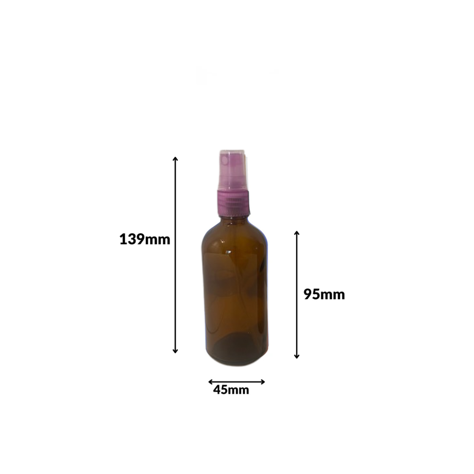 Aceste recipiente din sticla ambra sunt prevazute cu pulverizator spray din material plastic mov si un capac din plastic transparent.