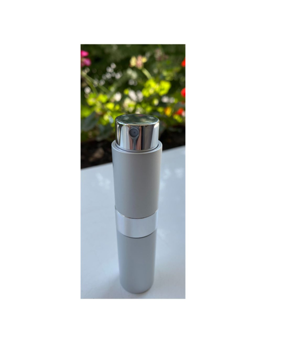 Recipient reincarcabil cu pulverizator spray alcatuit dintr-o rezerva din sticla cu volum de 10ml. aflata intr-o carcasa din aluminiu de culoare argintie.